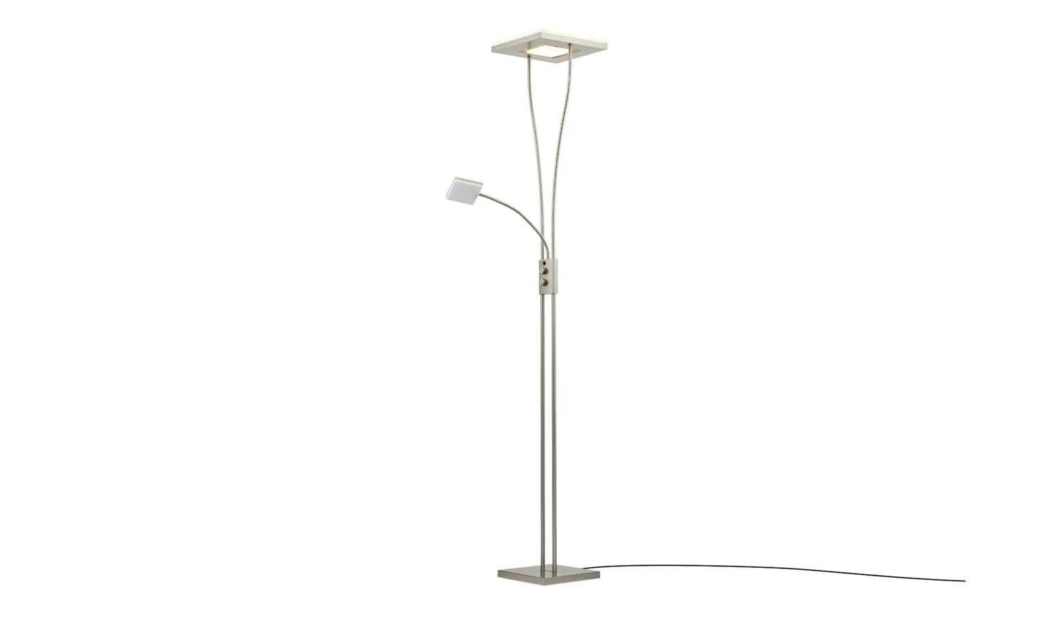 Dieser LED-Deckenfluter besticht mit seinem futuristischen Design. Die Lichtquellen, des aus Stahl gefertigten Fluters können getrennt geschaltet werden. Der eckige Fluterkopf kann per Fernbedienung gedimmt werden und ist zusätzlich mit einem RGB-Farbwechsler ausgestattet. Besonderes Highlight an dem Fluterkopf ist die bewegliche, eckige Lichtquelle. Diese kann so ausgerichtet werden, dass sie nach oben oder nach unten strahlt. Die äußere Lichtquelle im Fluterkopf ist nicht beweglich und strahlt durch seine satinierte Acrylscheibe nach oben. Der Lesearm ist mit einem flexiblen Arm ausgestattet und kann nach Belieben verstellt werden. Er wird über den Drehdimmer geschaltet und nicht über die Fernbedienung. Der Fluter wirkt mit einer Farbtemperatur von 3000 Kelvin angenehm warmweiß.